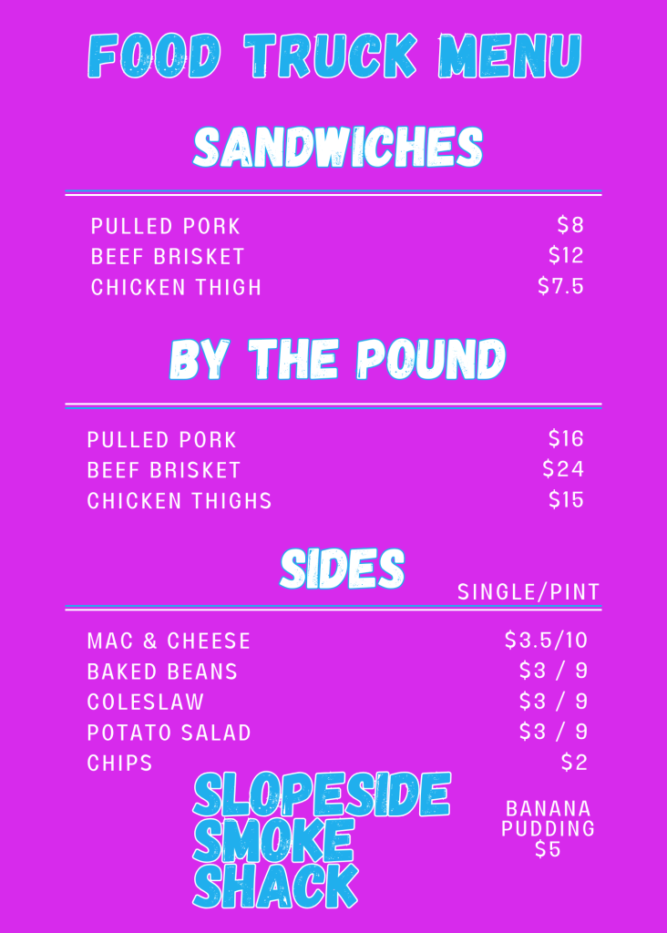 Check our Instagram or Facebook for schedule and locations @slopesidesmoke